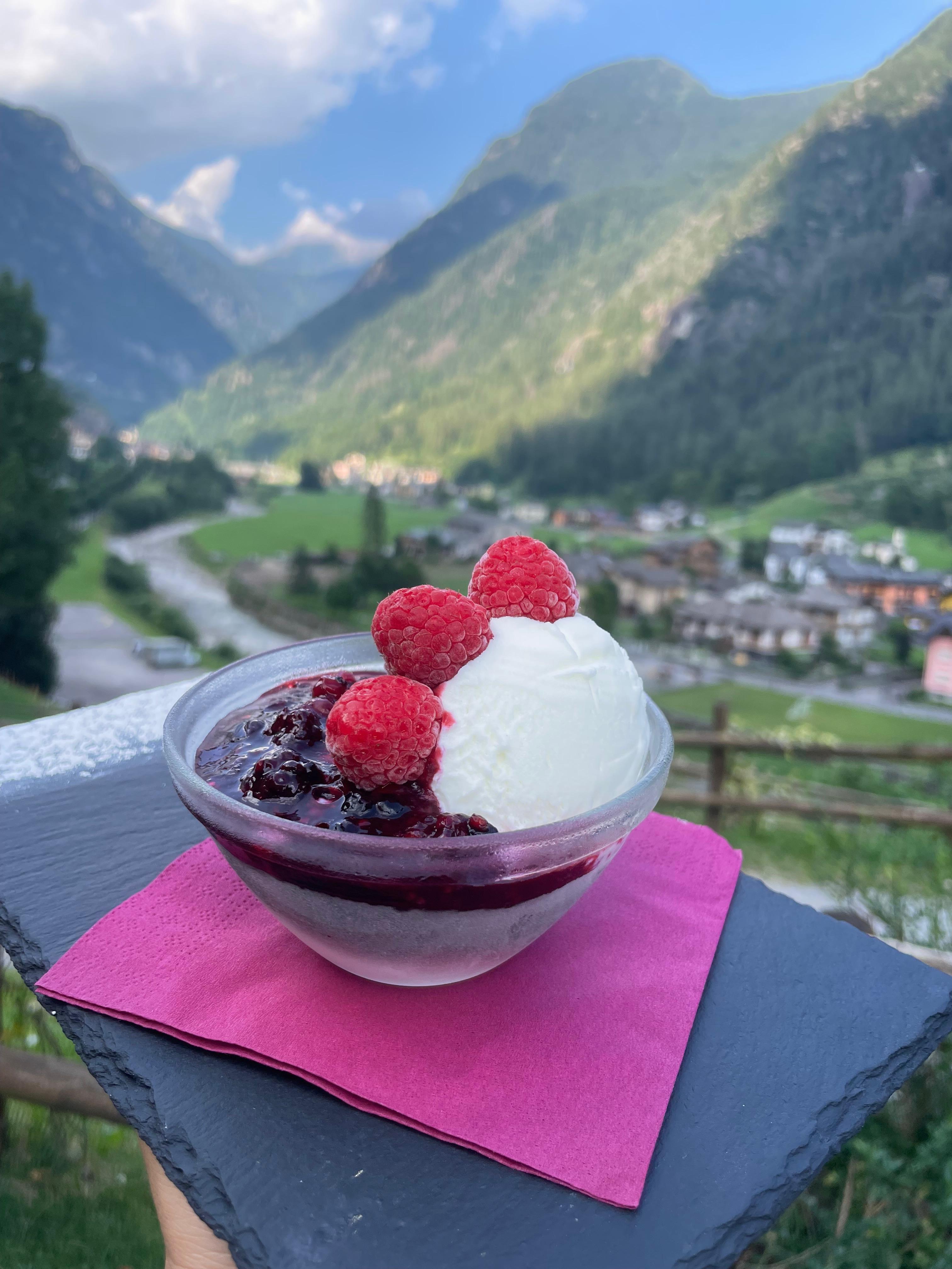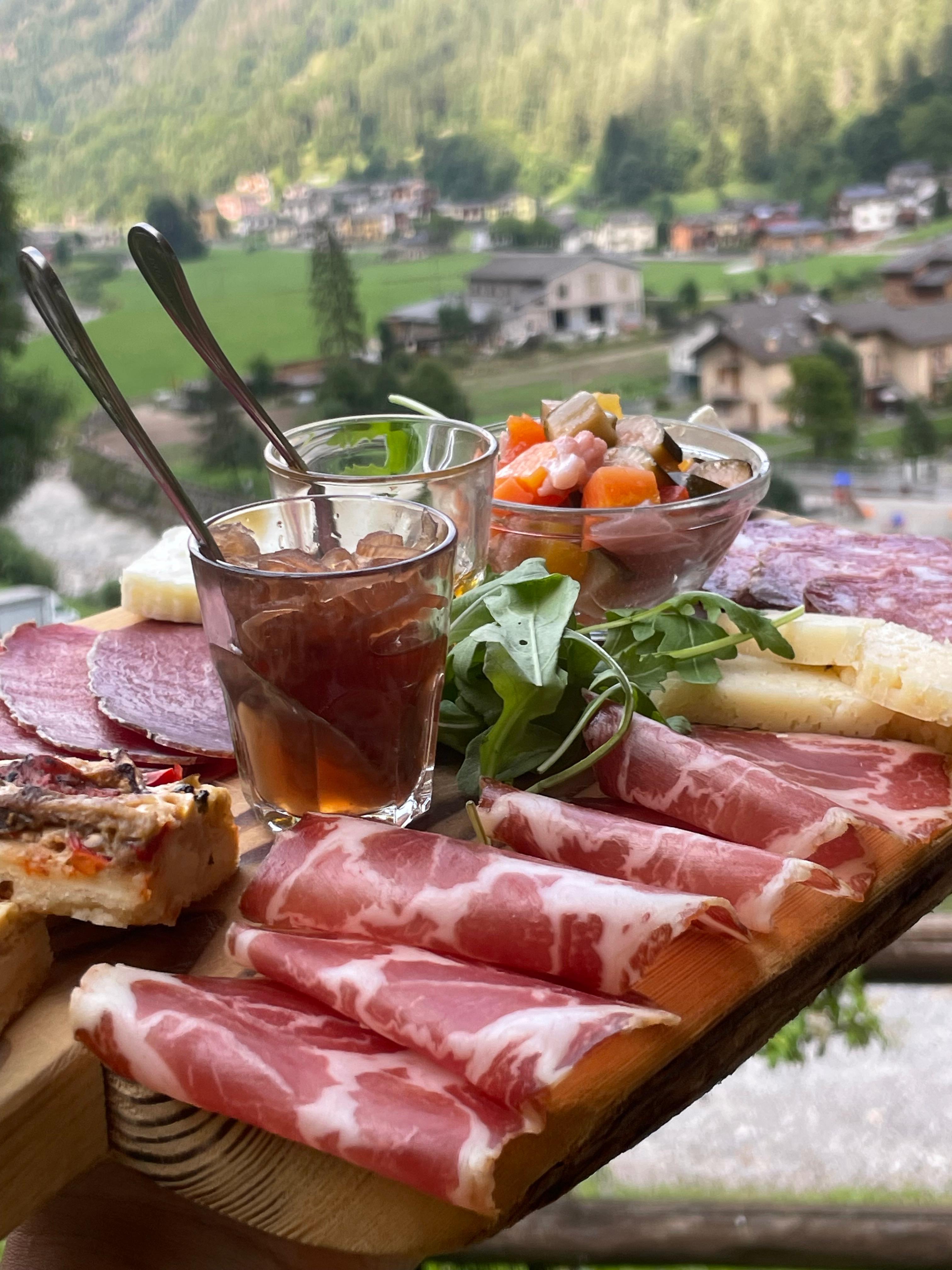 Durante la bella stagione, la nostra soleggiata terrazza si trasforma nel palcoscenico ideale per i vostri pranzi. Da qui potrete godere di una vista panoramica impareggiabile sul borgo di Branzi e sulle vette delle prealpi orobiche che incorniciano la vallata, gustando il meglio della nostra cucina all´aria aperta.