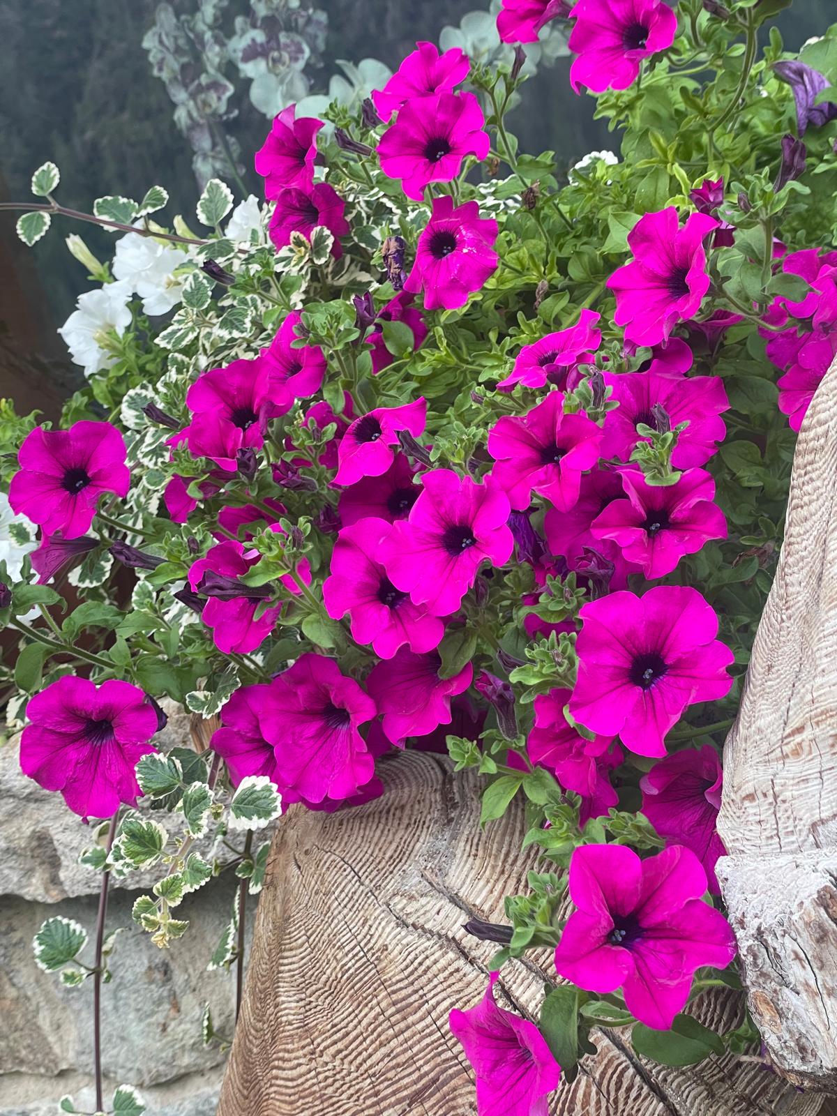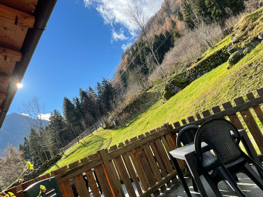 Balcone privato esposto a sud/est con veduta su tutta la valle. Pavimento in legno di larice, mobili e pareti realizzati interamente da Alex con legname di recupero.
