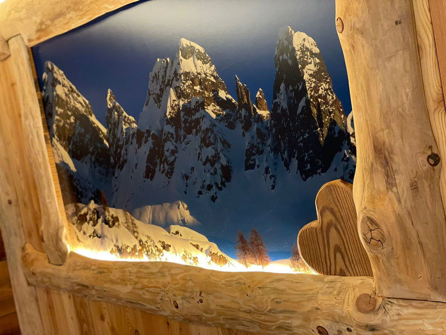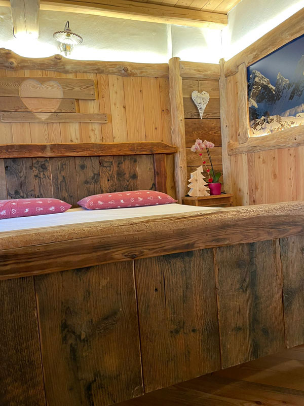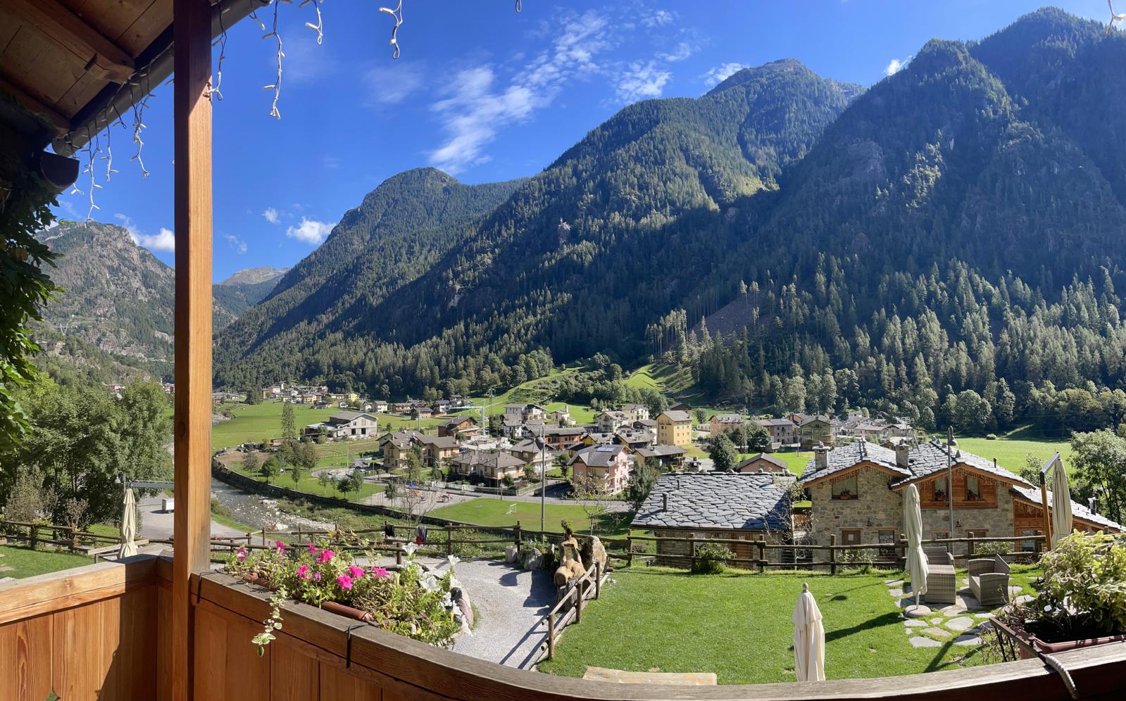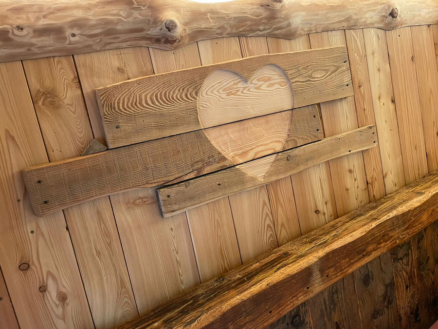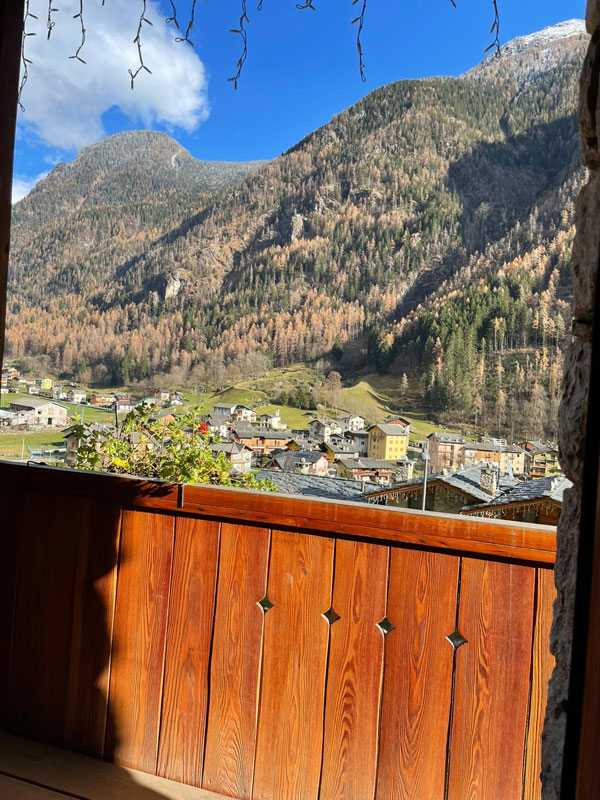 Balcone privato esposto a sud/est con veduta su tutta la valle. Pavimento in legno di larice, mobili e pareti realizzati interamente da Alex con legname di recupero.