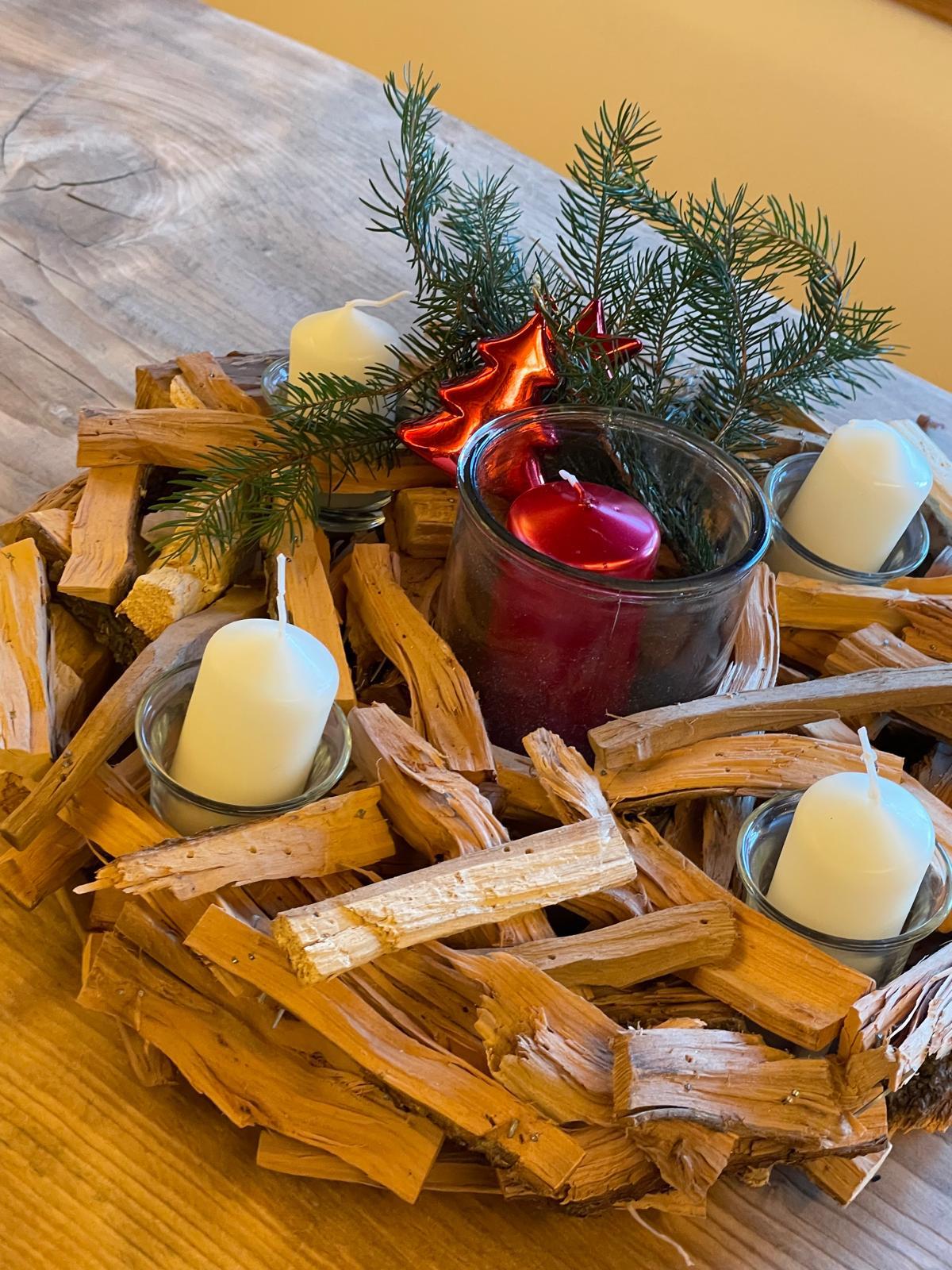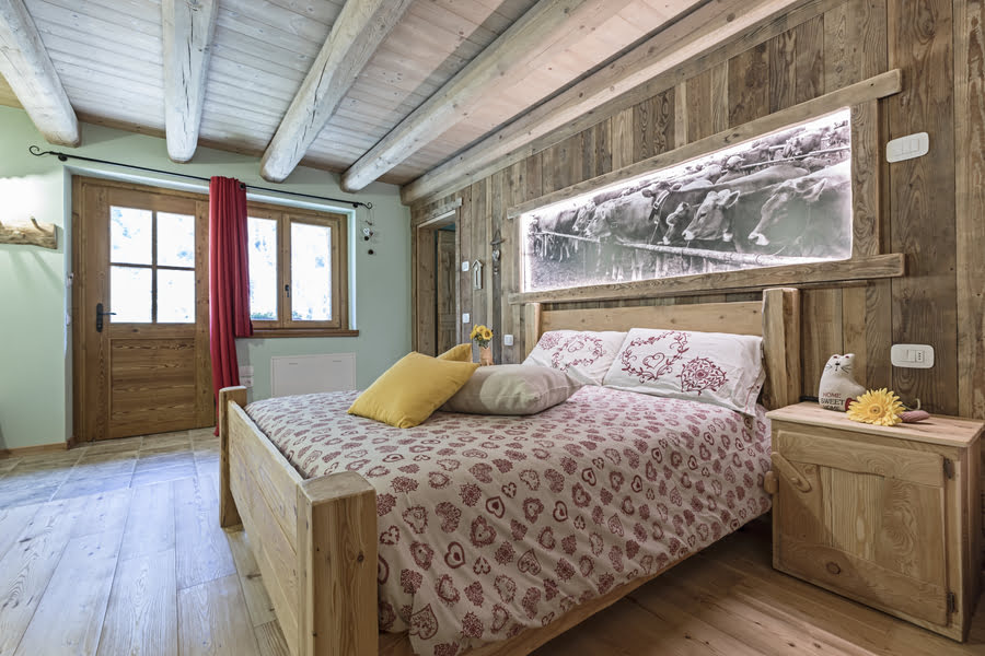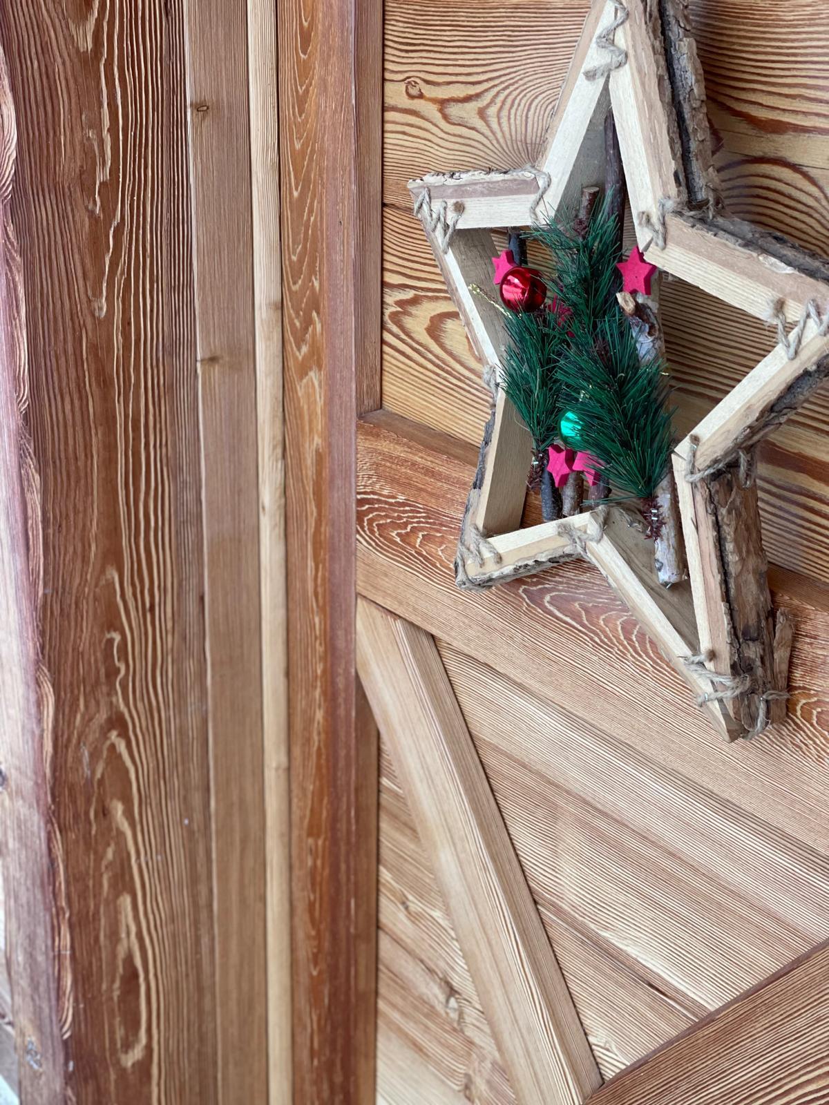 Pavimento in legno di larice, mobili e pareti realizzati interamente da Alex con legname di recupero.