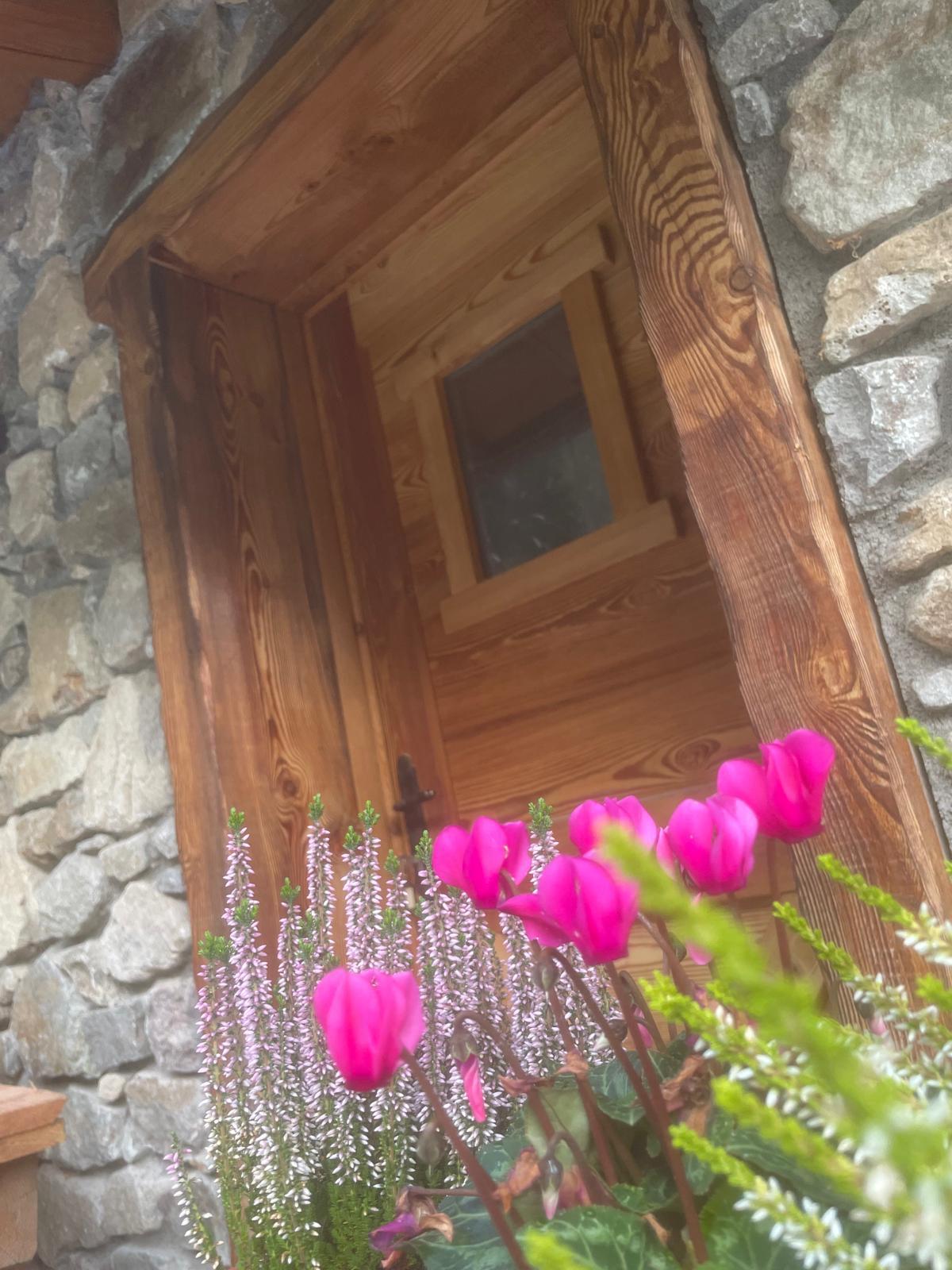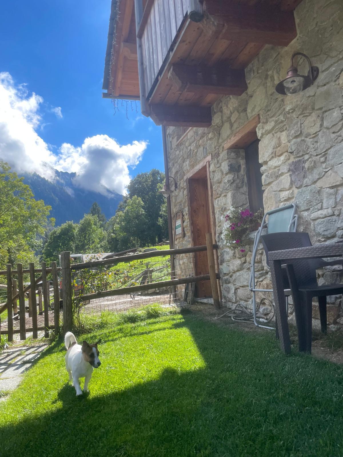 Accesso indipendente dall´esterno con giardinetto parzialmente recintato dotato di sdraio, sedie e tavolino con vista sulle montagne