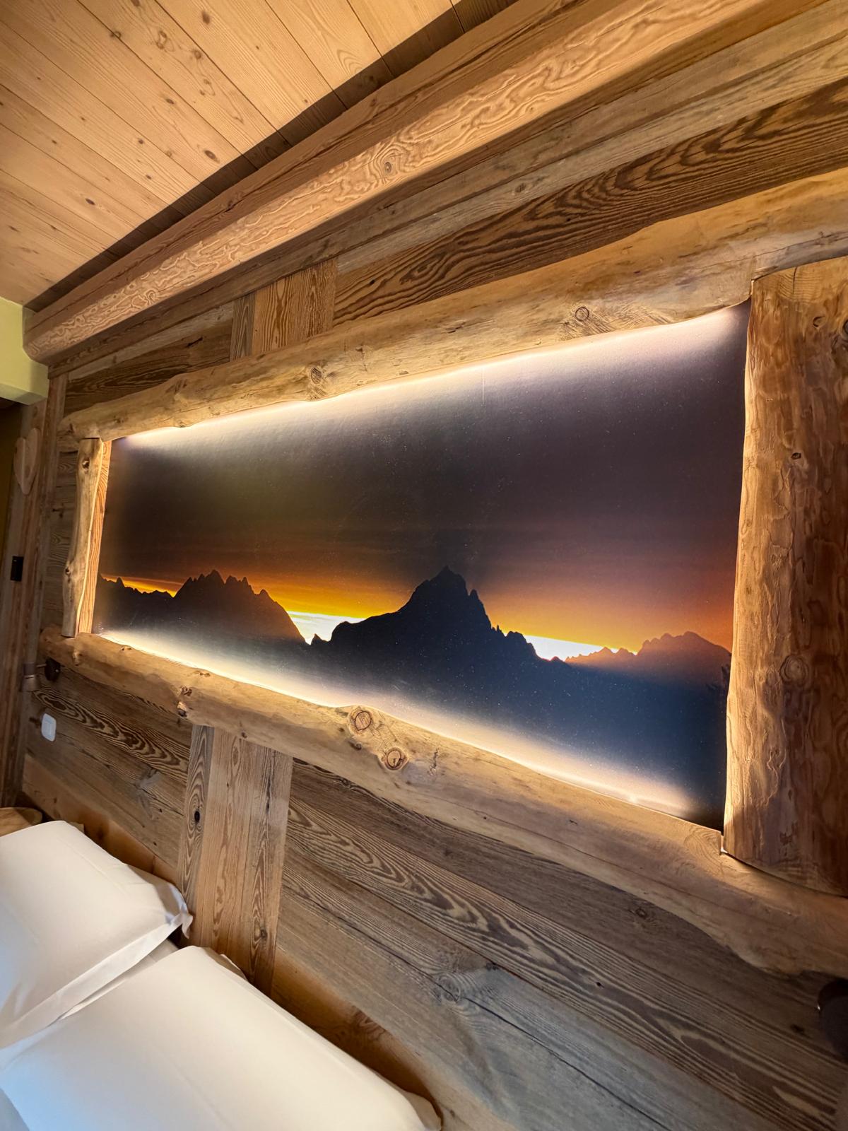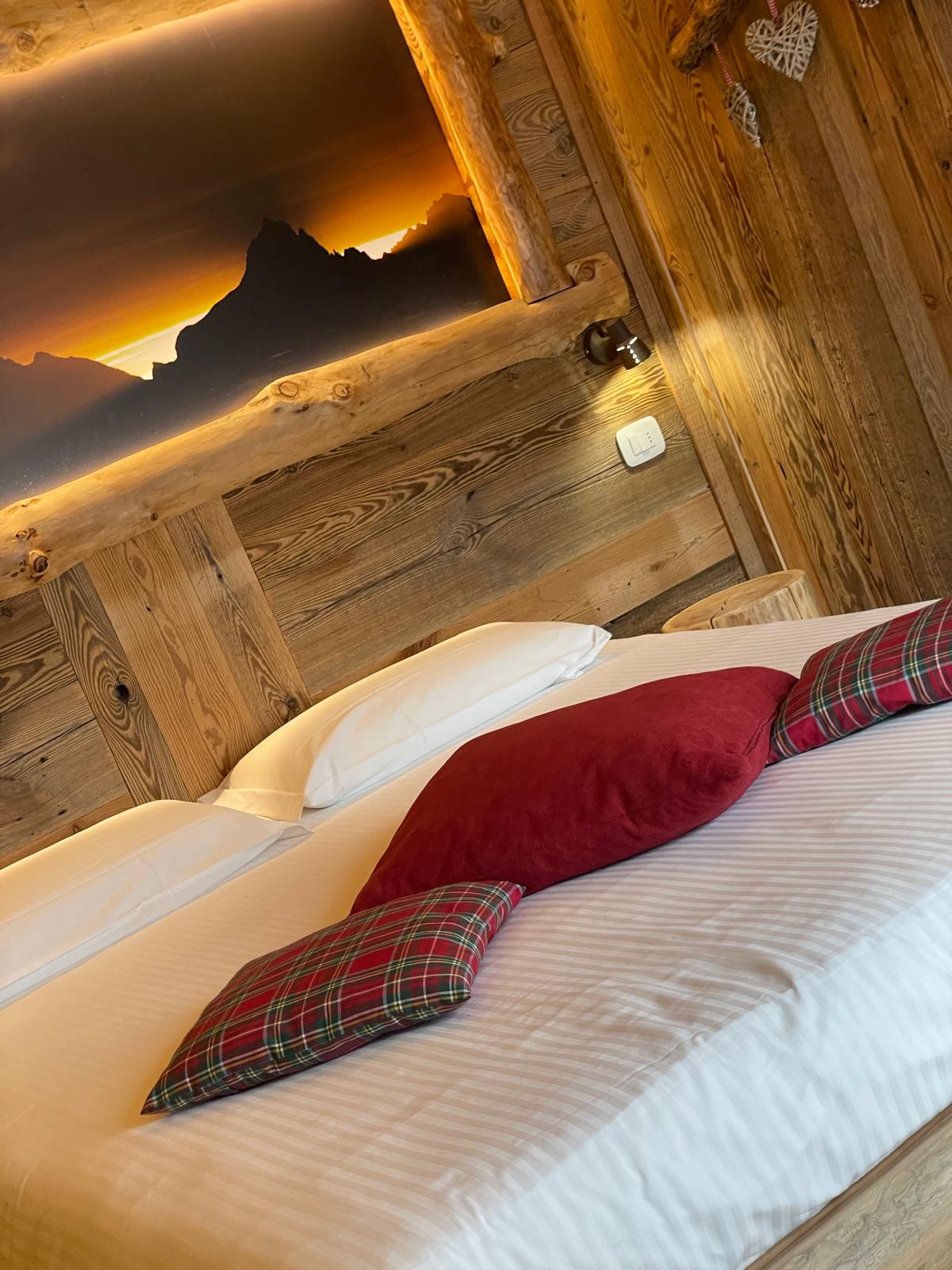 Camera matrimoniale calda ed accogliente, completamente rivestita in perline di legno antico recuperato da vecchie baite, situata al piano terra nel fabbricato antistante il ristorante dell´agriturismo.